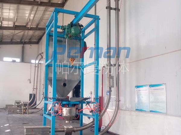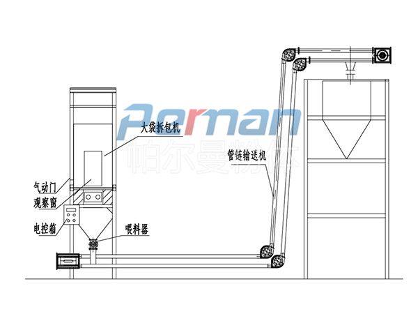生產(chǎn)原材料會在皮帶輸送的作用進行進入到噸袋拆包機中進行拆包作業(yè),分離出的散料會在出料口直接進入到管鏈輸送機設備入料口中進行傳輸作業(yè)。